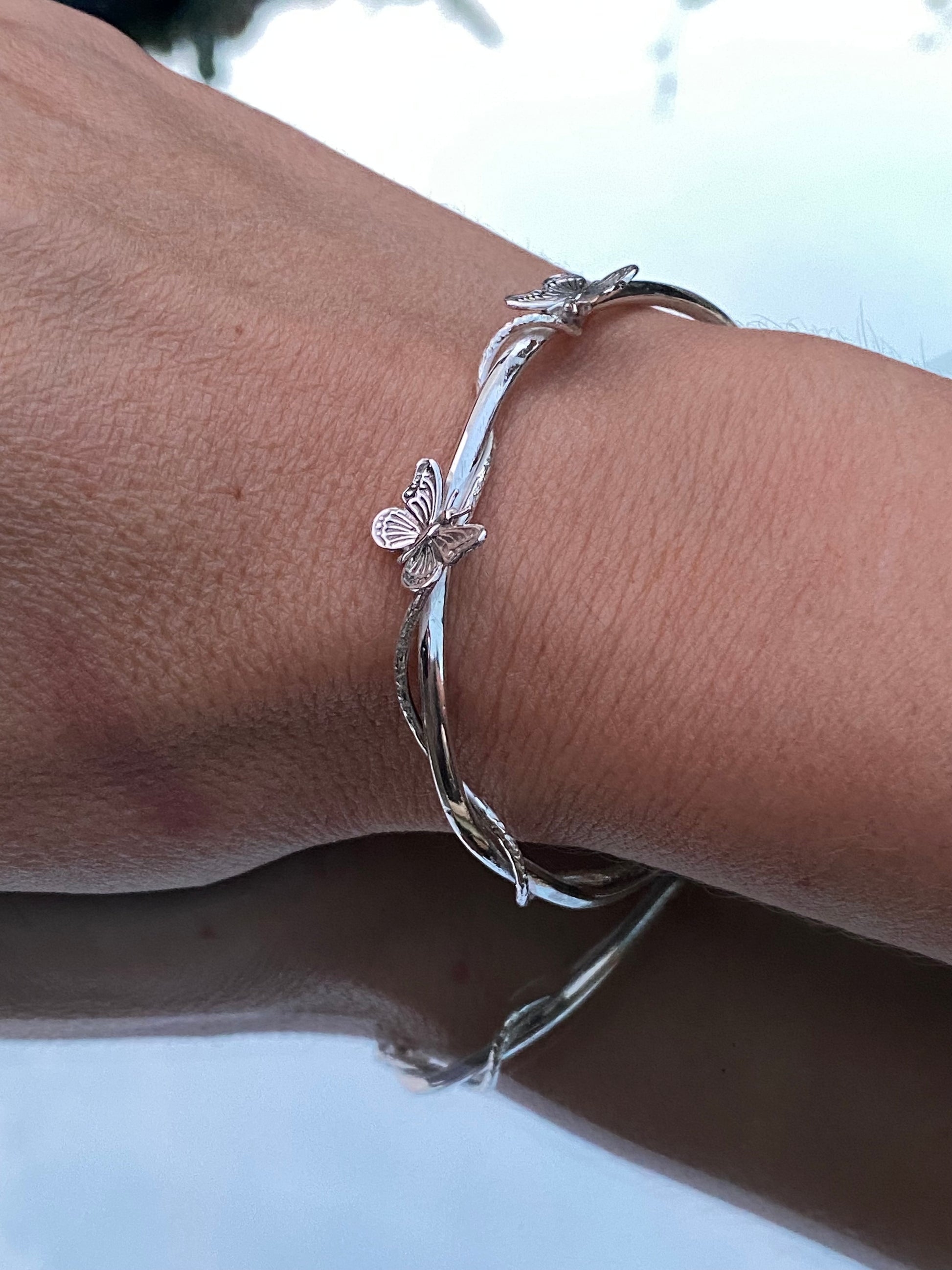 Modelată manual cu detalii inspirate din natură, brățara împletește două fire de metal ca pe două povești ce se întâlnesc.