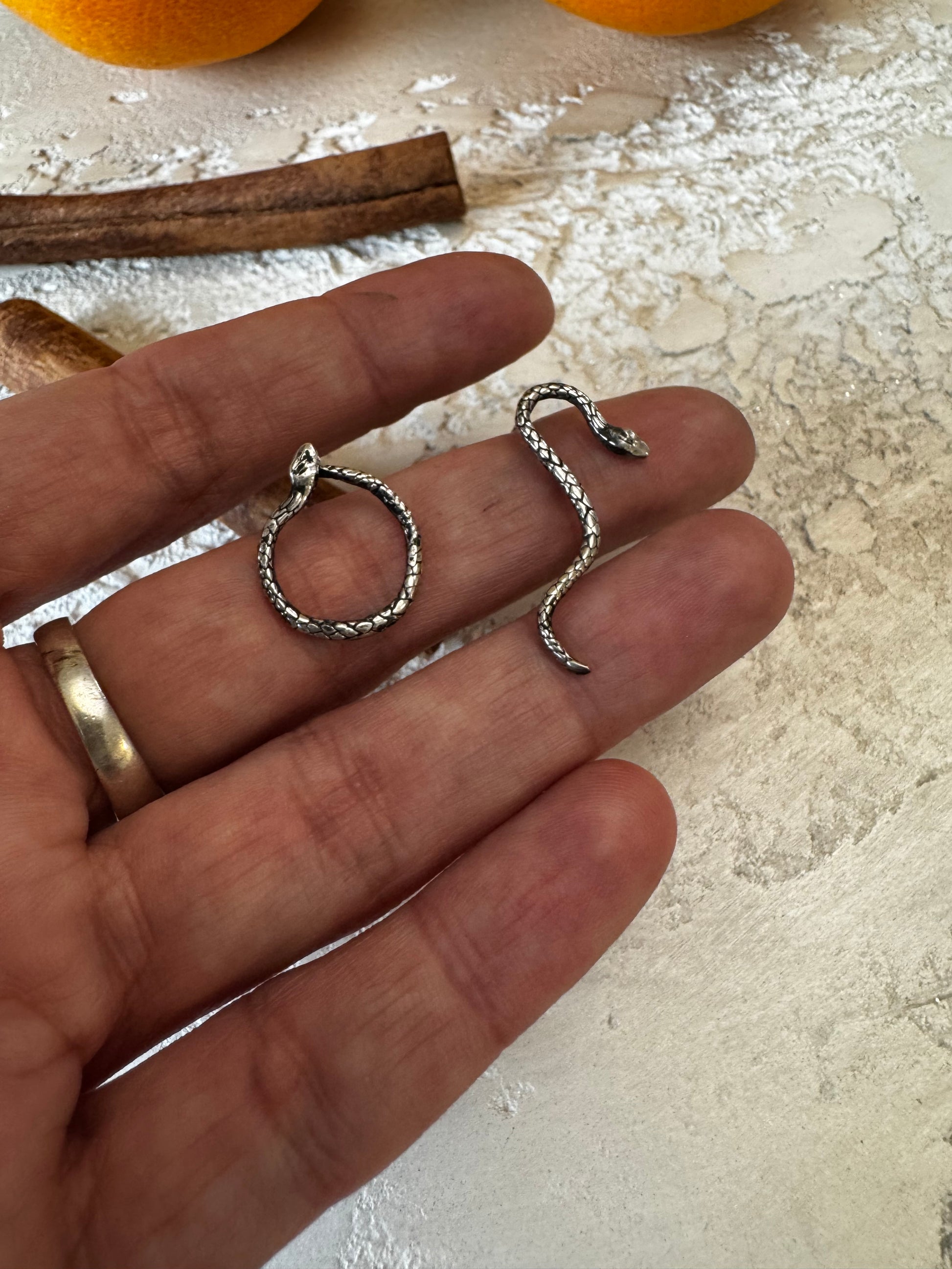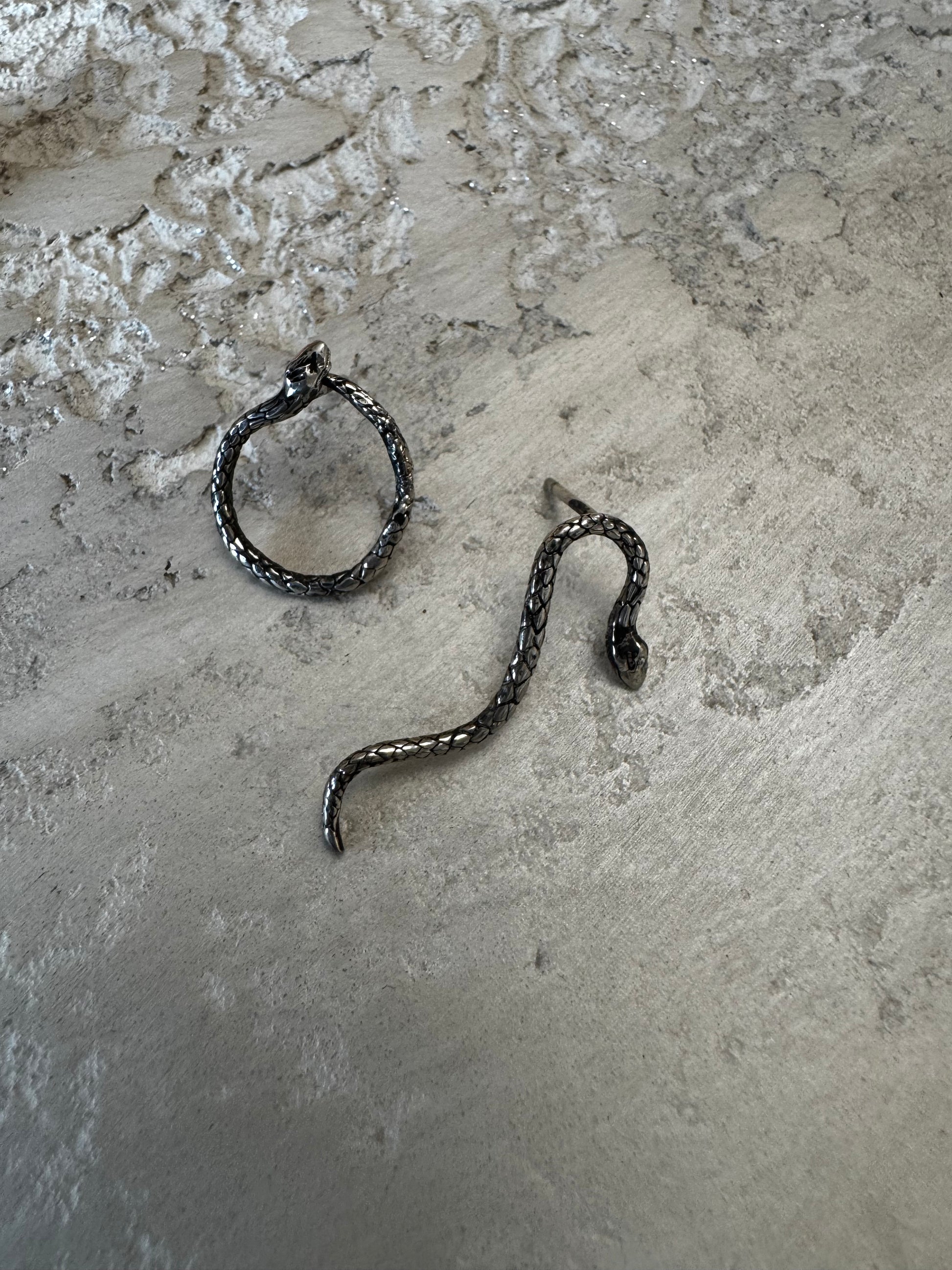 O pereche asimetrică, creată în argint masiv, inspirată de simbolul șarpelui – ființă sacră a renașterii și a înțelepciunii. Un cerc complet, în forma uroborusului – șarpele care își mușcă propria coadă – și un altul, liber și ondulat, ce pășește dincolo de formă. Împreună spun povestea echilibrului dintre ciclicitate și eliberare. Bijuteria ideală pentru femeia care dansează cu schimbarea și își onorează puterea interioară.