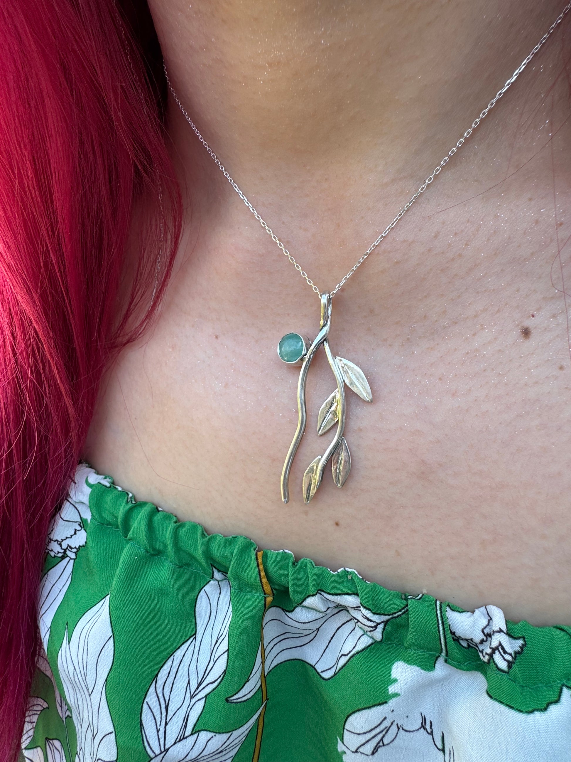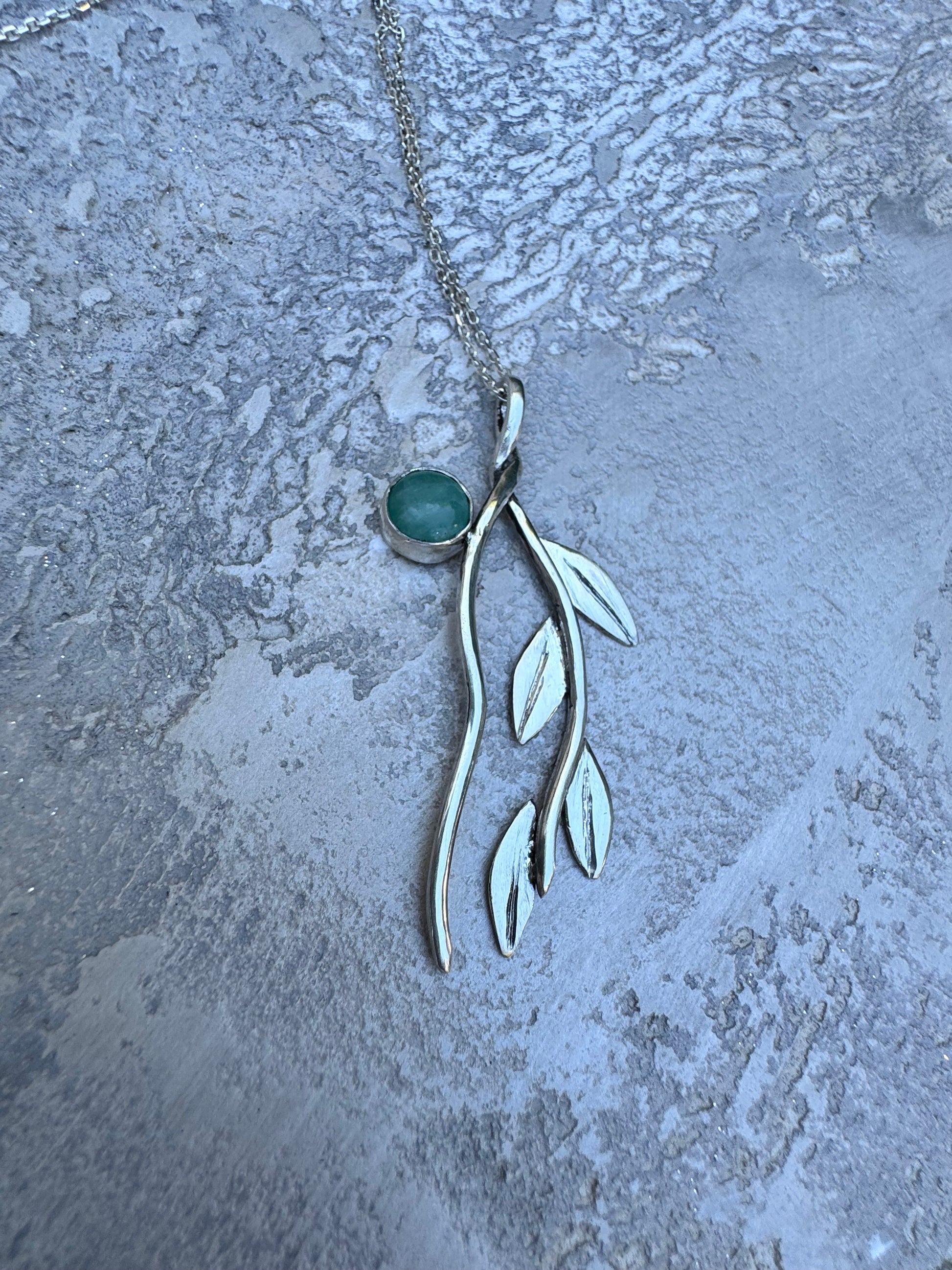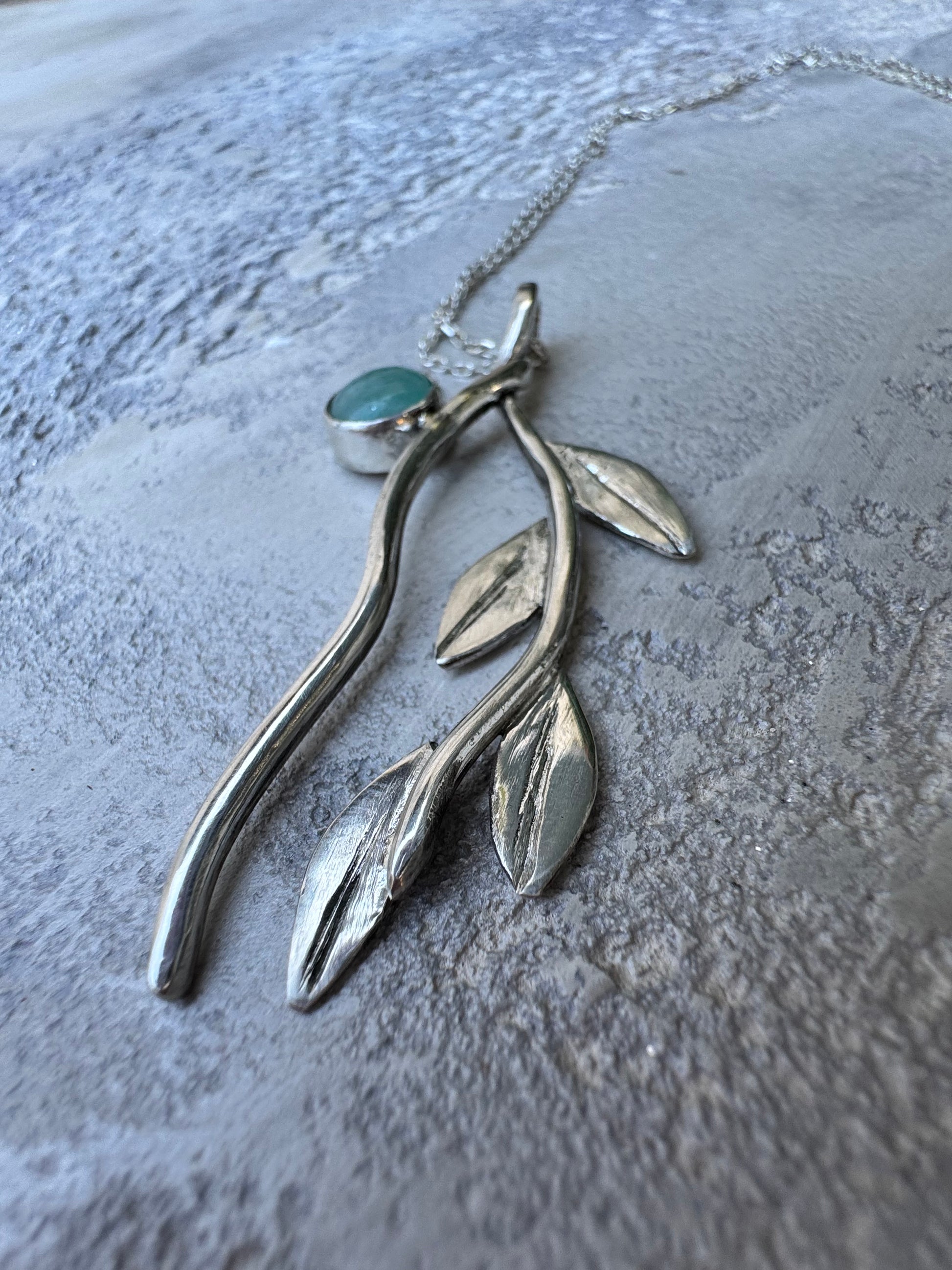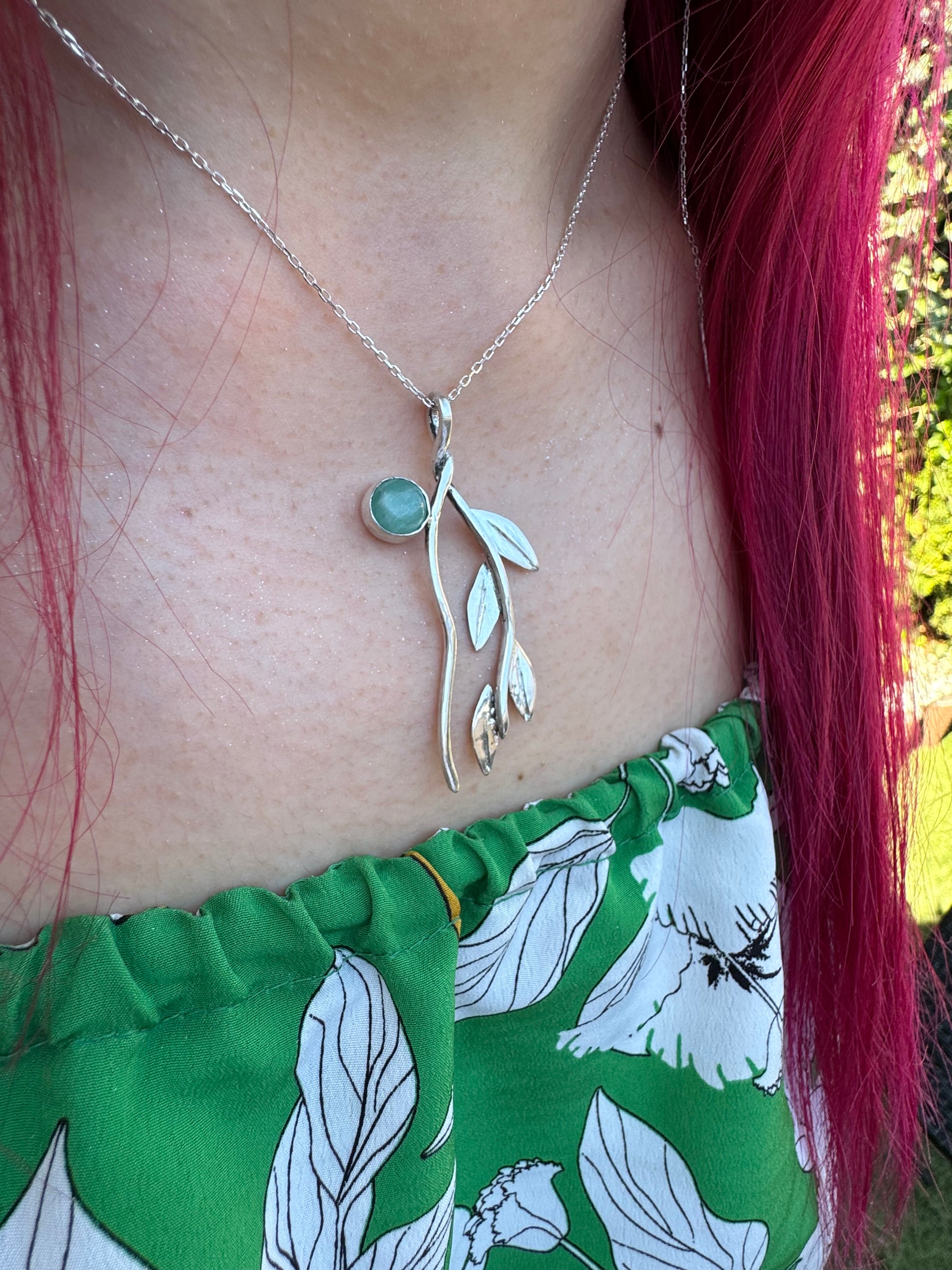 Modelat manual din argint, pandantivul redă forma organică a unei salcii – cu linii curgătoare și frunze fine. Amazonitul, cu nuanța sa verde-albăstruie calmă, întărește mesajul: echilibru, protecție emoțională și puterea de a spune „da” propriei sensibilități.