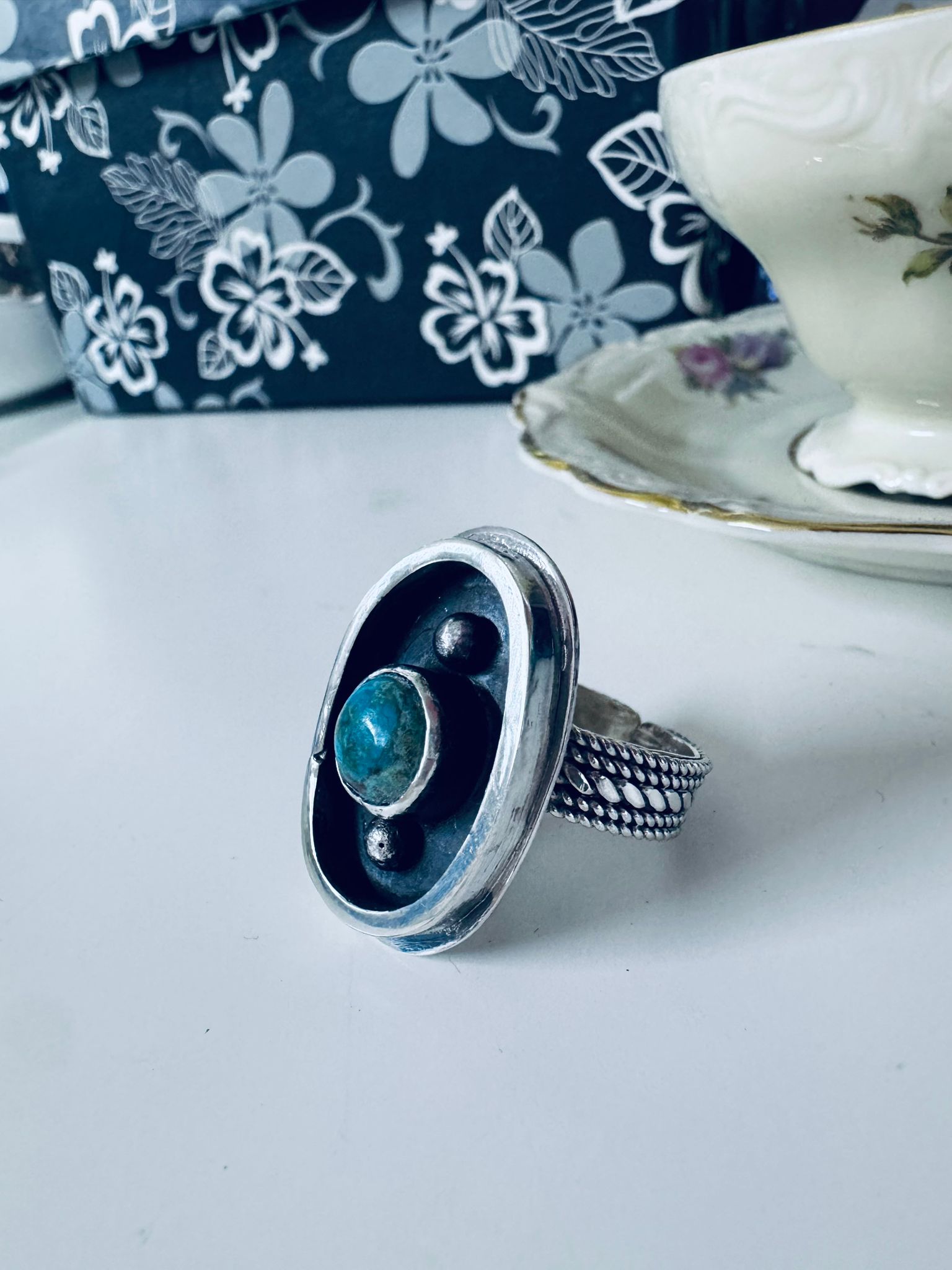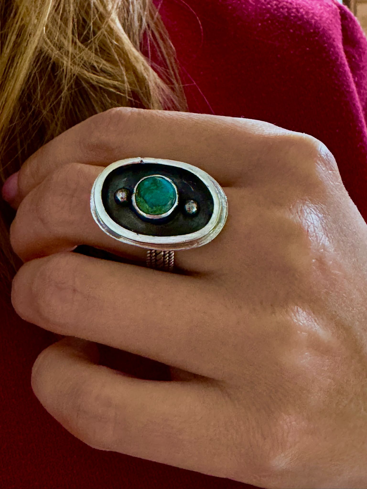 Argintul patinat, lucrat în formă de capsulă, adăpostește în centru un turcoaz natural – piatra cerului și a protecției divine. În jurul său, detaliile metalice creează impresia unui portal, o fereastră către lumile interioare.